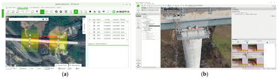 After choosing the case study bridge and establishing the control points, flight planning for UAV image capturing was performed. Figure 3a shows the four strips of flight path planned for the bridge area, and 3b shows a sample of an image in PIX4D software.