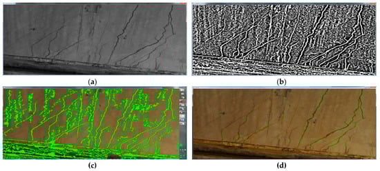 Results of crack detection in the Wonjudaegyo Bridge, Korea: (a) Data extracted from channel L (luminance); (b) cracks using Gaussian adaptive threshold method; (c) cracks after extracting area boundaries; (d) final cracks overlaid with image.