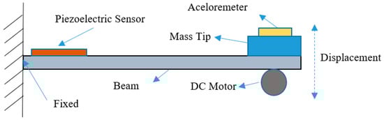 The weight of the beam, the tip mass plus motor was about 200 g. The beam’s dimension was 20 cm × 5 cm. Three different sizes of commercial piezoelectric sensors were tested (Figure 2b). A LabView program was developed to acquire and to show the accelerometer and piezoelectric sensor signals and also to calculate the electric power delivered to a resistive load.
