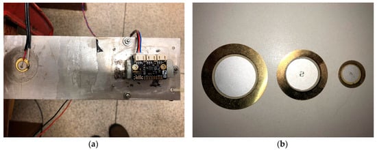 As the beam is fixed at one side and the free beam side oscillates, the beam and piezoelectric sensor deform (bend), generating an electric field [15,16,18]. The cantilever beam must oscillate at the resonance frequency in order to provide the higher diaphragm deformation and the consequent higher electric power that is generated. The piezoelectric diaphragms used in this work consist of a circular brass plate with a circular piezoelectric ceramic. The thickness of the plate and piezoceramic are 0.22 mm and the transducer element can vary between 9 mm to 25 mm [15].