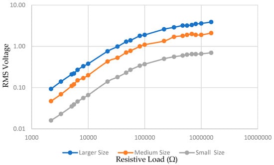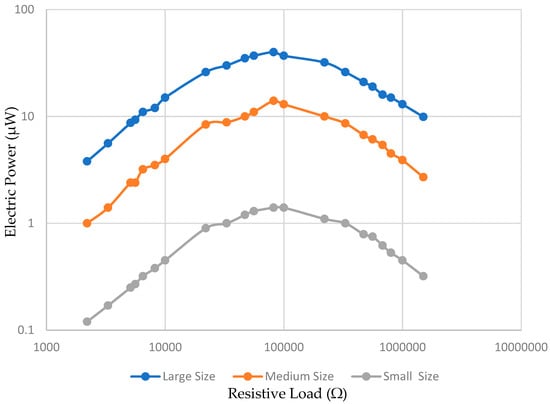 We found a frequency resonance of 7.7 Hz and acceleration of 1.3 g (where g is the gravitational acceleration). Figure 3 shows the voltage generated for the three different piezoelectric sensors. The maximum output RMS voltages obtained were 2.9 V, 2.10 V and 0.6 V for the large, medium and small sizes, respectively. For all transducers sizes, we found the maximum power transfer to be 82 kΩ approximately (Figure 4). The maximum electric power measured at a load of 82 kΩ were 40 µW, 14 µW and 1.4 µW.