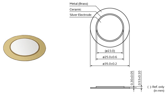 The piezoelectric effect occurs in materials that, when subjected to a mechanical stress, produce an output voltage (direct effect). The reverse effect also occurs, i.e., by applying an electric voltage in the piezoelectric material, a mechanical deformation arises. The equations, and more details can be accessed in [13,14]. The piezoelectric transducers, shown in Figure 1, have a ceramic disk of 25.0 mm × 0.23 mm, and a brass plate of 35.0 mm × 0.30 mm are already consolidated for partial discharge detection in power transformers [13]. However, this sensor was not validated for the diagnosis of the evolution of the partial discharge phenomenon.