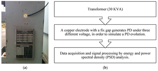 The objective of this research is to evaluate the performance of piezoelectric sensors in the identification of PD evolution. For this, a piezoelectric sensor was attached to the housing of a power transformer, according to Figure 2a and the following procedure was performed according to the schematic of Figure 2b.