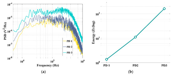 Power spectral density for different PD levels (a) and energy of acoustic signal for different PD levels (b).