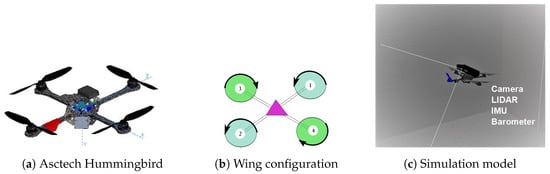 The simulation model is based on the Asctec Hummingbird multirotor (Figure 1a) and is equipped with an Inertial Measurement Unit (IMU) for a 9 DOF position estimate, barometer for altitude control, a Microsoft Kinect that doubles as an RGBD camera and a 2D Light Detection and Ranging LIDAR sensor . The wing configuration is as presented in Figure 1b, and shows the forward motion by the arrow. Through testing we found that this configuration provides better agility with the kinect sensor mounted on the top. The kinematics and dynamics of the UAV were adopted as described in [11].