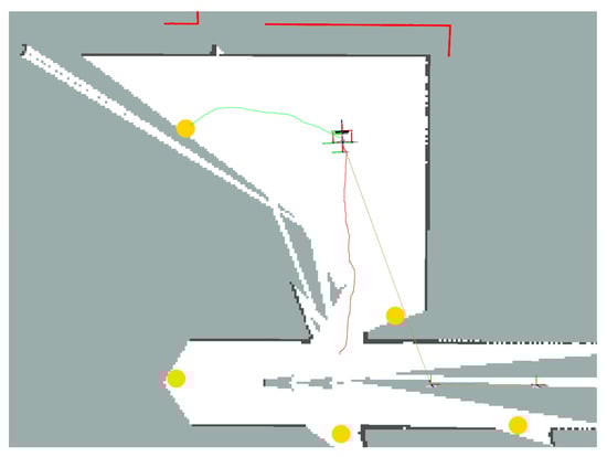 For autonomous exploration, we used the frontier exploration method. A frontier on the map is the boundary between explored and unexplored regions. The algorithm works on a simple principle where visiting such frontiers constantly increases new information about the area and pushes the boundary as more areas are explored [17]. The exploration algorithm aims at detecting, labeling and listing all the edges (cells) that are explored and unexplored as frontier regions. By calculating the minimum size threshold, it generates a list of suitable frontiers for the vehicle to navigate to from its current pose while ignoring smaller frontiers. The selection for the next best frontier to visit is based on different criteria, such as, distance to the frontier from the current pose, and the size of the frontier. As the UAV continuously explores the region the grip map is updated using the SLAM method and is utilized for autonomous navigation. Figure 2 shows the UAV exploration using the frontier algorithm. The yellow circles are the detected frontiers. The red trajectory is the UAV’s current trajectory, and the green trajectory shows the plan to selected next frontier. Figure 3 shows the gazebo model of the indoor scene. It has several rooms with similar looking features along with corridors and doors. The UAV was able to explore all the areas successfully using frontier exploration. Figure 3b, shows the final grid map obtained by the exploration method.