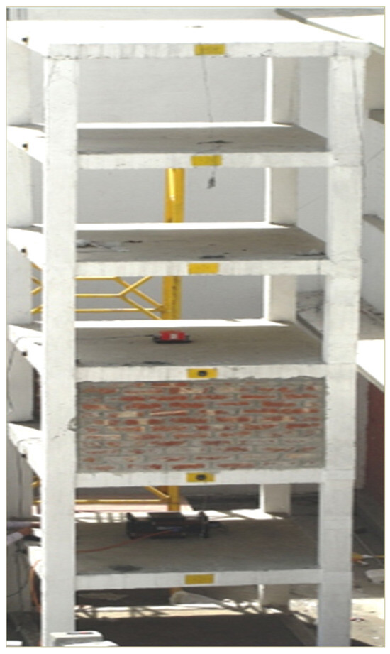 The building model used in the research study is 2000 mm by 1500 mm in plan dimension with 1100 mm storey height. The building consisted of four columns (150 × 150 mm size), beams (100 × 175 mm size) and slabs (65 mm thick), constructed in M20 grade concrete and Fe415 reinforcement. The building was designed in accordance with IS 456-2000. The RC columns comprised of four number 12 mm dia. bars width 6 mm lateral ties, spaced at 150 mm c/c. The RC beams comprised of 2 numbers each 12 mm dia. bars at top and bottom reinforcement with 6 mm dia. stirrups at 120 mm c/c, and RC slab having 6 mm dia. at 150 mm c/c reinforcement, in both the directions. The stiffness of the prototype model was varied with the introduction of masonry infill in a storey along the direction of the shorter span of the building (Figure 1). The thickness of masonry infill was 100 mm spread across a length and height of 1350 mm and 930 mm, respectively.