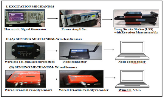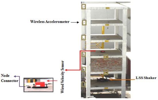 The sensing network comprised of eight MICROSTRAIN LXRS Tri-axial wireless accelerometers, six of which were installed on the beam in the direction of longer span (X-axis), while the remaining two were installed along the shorter span (Y-Axis) of the framed structure. These were used to record acceleration at required locations in a structure. SYSCOM MR2002-CE Tri-axial wired velocity sensors were also employed in the present study containing active geophones capable of recording time series data with remarkable accuracy. Wincom V7.1 was used as communication software for base correction and for storage from the recorder to data processing unit. The wireless sensors were fixed using 5 mm thick aluminium plate anchored to RC floors/beam, whereas the wired velocity sensors were placed on the surface, i.e., the floor level of the RC frame building. The sampling rate used was 128 Hz, hence a total of 3840 data sets were recorded in 30 s for post processing.