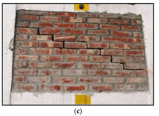 Progressive damage in masonry infill wall. (a) Damage case 1. (b) Damage case 2. (c) Damage case 5.