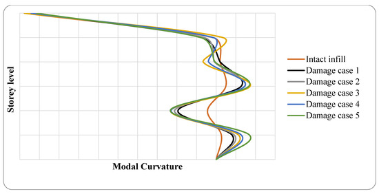 Figure 6 presents the comparison between changes in curvature of mode shapes at different damage extents for fundamental mode. It is observed that there is a clear deviation of modal curvature for damaged situation to undamaged situation. The maximum peaks for the mode, as seen in the graph, corresponds to the same damage location, i.e., the second storey of the masonry infilled RC building.