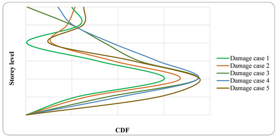 In this study, the fundamental mode (N = 1) of five damage cases were considered for the computation of CDF and these values were plotted against each storey level. Figure 7 clearly shows that the peaks of CDF values also increase with increase in damage levels. It indicates change in stiffness of the structure due to progressive damage in masonry infill.