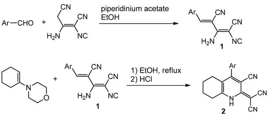 The starting AMDMs 1 were prepared by the reaction of a malononitrile dimer with aromatic aldehydes under basic catalysis using piperidinium acetate. We succeeded to prepare (3-cyano-5,6,7,8-tetrahydroquinolin-2(1H)-ylidene)malononitriles 2 by the condensation of AMDMs 1 with N-(1-cyclohexen-1-yl) morpholine under prolonged heating (Scheme 1). Compounds were obtained in the form of off-white or yellow powders in 30%–60% yields.