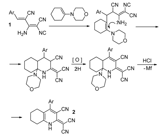 We suggest that AMDMs reacted with N-(1-cyclohexen-1-yl)morpholine to form a Michael type adduct, followed by intramolecular cyclization through the attack of the amino group at position C-1 of the cyclohexene ring. The oxidation of the partially saturated pyridine ring with air oxygen occurs during the reaction. Subsequent acidification with hydrochloric acid leads to the elimination of morpholine molecule, and (3-cyano-5,6,7,8-tetrahydroquinolin-2(1H)-ylidene)-malononitriles are formed (Scheme 2).
