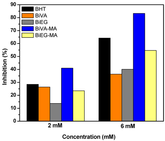 To evaluate the antioxidant activity of synthetized materials the phosphomolybdenum method was used. The Mesoporous alumina (MA) did not show antioxidant activity. BiVA and BiEG presented antioxidant properties. Biphenolic compounds anchored on mesoporous alumina presented higher antioxidant activity than those free compounds (Figure 2).
