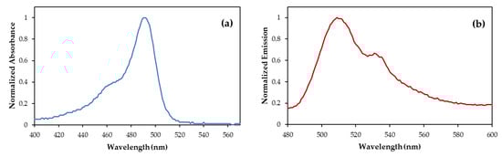 Normalized UV-visible spectrum (a) and fluorescence spectrum (b) of BODIPY derivative 2 in acetonitrile.