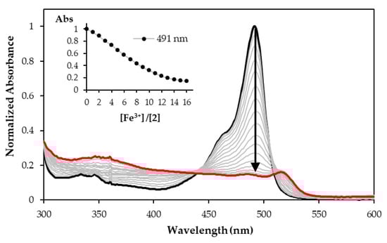 Spectrophotometric titration of BODIPY derivative 2 with addition of increasing amounts of Fe3+ in acetonitrile. The inset represents the normalized absorbance at 491 nm ([] = 1 × 10−5 M).