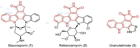 Particularly, indolocarbazoles and the related pyrrolocarbazoles have attracted much interest for their biological properties []. For example, naturally occurring Staurosporin (1), Rebeccamycin (2) and Granulatimide (3) are lead structures in the development of novel anticancer agents due to their potent kinase inhibitor activities [] (Figure 1). Furthermore, some pyrrolo [3,4-a] carbazoles have been developed as checkpoint kinase 1 inhibitors structurally related to granulatimide [], and topoisomerase II poisons [].