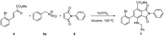 In a first approach, (E)-methyl 4-(2-bromophenyl)-2-oxobut-3-enoate (4), benzyl isocyanide (5a) and N-phenylmaleimide (6) were heated in toluene at 100 °C in the presence of a catalytic amount of yttrium trifluoromethanesulfonate (Scheme 1). In these conditions, methyl 7-(benzylamino)-6-(2-bromophenyl)-1,3-dioxo-2-phenylisoindoline-4-carboxylate (7) was obtained in 55% yield, as a yellow solid [].