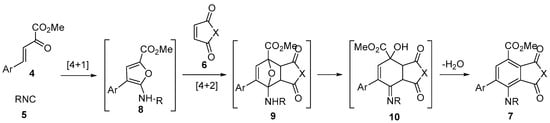The mechanism, outlined in Scheme 2, involves the [4 + 1] cycloaddition of α,β-unsaturated carbonyl (4) and isocyanide (5) to give unstable aminofuran (8). This is trapped in situ by maleimide (6) by means of a Diels–Alder reaction, leading to 7-oxabicyclo [2.2.1] heptene (9). Finally, oxygen ring opening and aromatization affords isoindole (7).