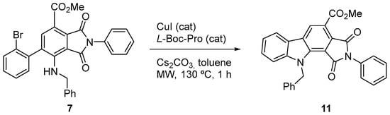Copper catalyzed intramolecular N–C coupling of isoindole 7 was efficiently achieved under microwave activation in toluene, in the presence of Cs2CO3 and 30% mol of L-Boc-proline. Thus, pyrrolocarbazole 11 was obtained in an excellent yield (Scheme 3) [].