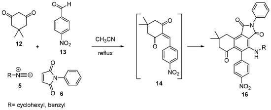 Thus, equimolar amounts of dimedone (12), p-nitrobenzaldehyde (13), cyclohexyl isocyanide (5b) and N-phenylmaleimide (6) were stirred in refluxing acetonitrile for 22 h, affording the expected. 4-(cyclohexylamino)-8,8-dimethyl-5-(4-nitrophenyl)-2-phenyl-8,9-dihydro-1H-benzo[e]isoindole-1,3,6(2H,7H)-trione (16a) with a 90% yield (Scheme 4) []. Interestingly, in contrast with our previous results, the addition of catalytic Y(OTf)3 [] did not improve the reaction. Analogously, the reaction with benzyl isocyanide (5c) affords the corresponding pentylaminoisoindole (16b).