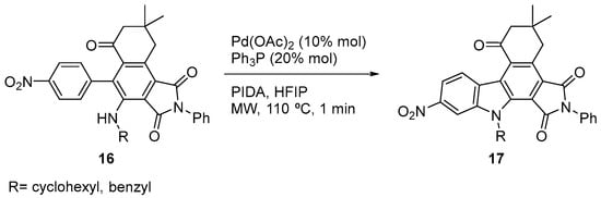 In this case, dehydrogenative N-C bond forming cyclization of the cycloadducts (16a,b) yields straightforwardly natural product-like pyrrolocarbazoles (17a,b). Thus, isoindoline-1,3-dione (16a) was subjected to a palladium catalysed dehydrogenative cyclization, using phenyliodine (III) diacetate (PIDA) as an external oxidant [,,,]. The reaction is completed under microwave irradiation at 110 °C in hexafluoroisopropanol (HFIP) in just one minute, affording pyrrolocarbazole 17a in 58% yield (Scheme 5) []. Analogously, pyrrolocarbazole 17b was obtained in similar conditions from isoindoline 16b. Pyrrolo[3,4-a]carbazole-1,3-diones (17a,b) can be considered analogues of granulatimide (3) in which the position of the imidazole ring is occupied by a pyrrole-2,5-dione, while a cyclohexanone is the place of the pyrrole-2,5-dione []. Remarkably, these complex pentacyclic compounds are readily and efficiently synthesized from simple starting materials in a two-step reaction sequence.