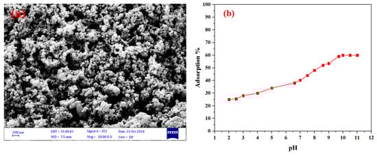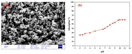 (a) The SEM image of activated carbon. (b) Effect of pH on the removal of rhodamine-B by activated carbon.