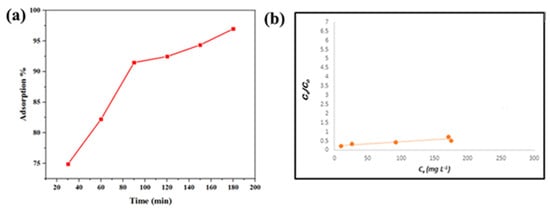 (a) Effect of time on the removal of rhodamine-B by activated carbon. (b) Langmuir adsorption isotherms for the rhodamine B.