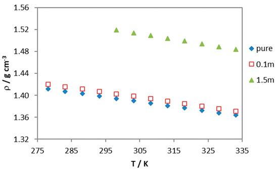 Figure 1 shows the densities of the pure IL, the lowest (0.1 m) and highest (1.5 m) mixture concentration samples are shown as a function of temperature. As expected, density increases with salt concentration. Density values for pure IL are in very good concordance with the findings of other authors [6,7].