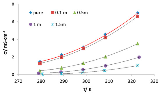 Electrical conductivity (σ) was measured by using a conductimeter Crison Basic 30 at the following temperature ranges: 278, 288, 298, 308 and 323 K; heating from 298 to 323 K, cooling until 278 K, and heating again to 288 K. The resolution was better than 1% of the measured value (with a minimum resolution of 2 × 10−6 mS·cm−1).