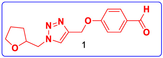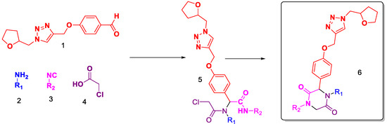 Once we have optimized conditions we repeated the same with the 4-((1-((tetrahydrofuran-2-yl)methyl)-1H-1,2,3-triazol-4-yl)methoxy)benzaldehyde (1) to obtain Ugi adduct with aniline (2), N-propyl isocyanide (3), 2-chloacetic acid (4) Scheme 1 (5%–95%) followed by SN2 cyclization product Scheme 1 (6%–90%) under mild efficient conditions. The confirmation of products was through NMR spectroscopy, where we can observe the absence of amide proton in the 1H NMR at around 5.76 ppm.