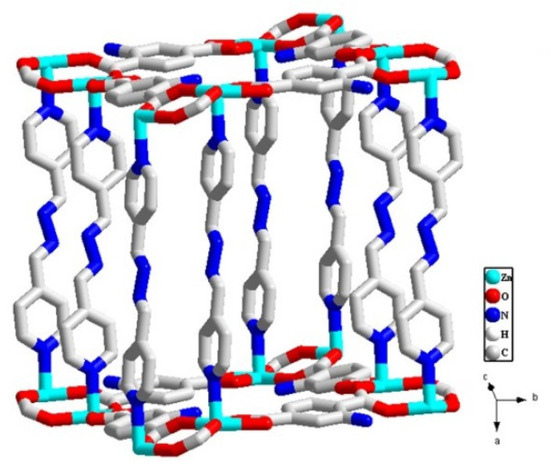A guest-filled phase of TMU-17-NH2 was synthesized by the solvothermal reaction of NH2-BDC, 4-bpdb and Zn(NO3)2·6H2O in DMF at 80 °C for 72 h and isolated as brown block-shaped crystals [10]. TMU-17-NH2 is a two-fold interpenetrated 3D framework bridged by dicarboxylates and 4-bpdb linkers. The 2D Zn-dicarboxylate layers are extended along the a-axis to form distorted square grids which are further pillared by 4-bpdb linkers along the b axis to form a 3D pillared-bilayer interpenetrated framework with a topology that can be described as a primitive cubic lattice (pcu) (Figure 1). As a result, the pore surface of TMU-17-NH2 is decorated with pendant amine (-NH2) and azine (=N-N=) functional groups. TMU-17-NH2 has 1D channels of approximately 3 Å in cross section (including van der Waals radii) that are not large enough to be accessible for N2 (kinetic diameters for N2: 3.75 Å) adsorption.