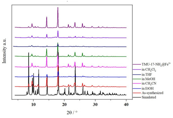 PXRD of TMU-17-NH2: as-synthesized, simulated; immersed in EtOH, CH3CN, MeOH, THF, CH2Cl2 and TMU-17-NH2@Fe3+.