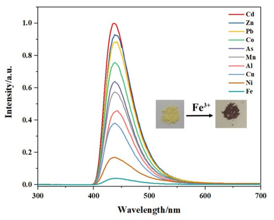 Until now, several MOFs have shown good performance for the detection of Fe3+ ions [4,5,6]. However, the detection processes of these MOFs towards Fe3+ ions take a relatively long time because their detection mechanisms are based on the ion exchange between the framework metal ions and Fe3+ ions. Thus, there is an urgent need to develop new fluorescent MOF sensors for the selective and fast detection of Fe3+ ion. Although excellent studies on a highly selective fluorescent probe for the detection of Fe3+ were reported by Zhou et al. [7], Sun et al. [6], and Wang et al. [8], the advantage of TMU-17-NH2 is that the overall quenching constant for Fe3+ in the concentration range of 50–250 μM is quantified to be ~41,000 M−1 and with a detection limit of 0.7 µM, which is comparable to that of other reports. It is very exciting that TMU-17-NH2, as an Fe3+-probe, was not influenced by the presence of other metal ions such as As3+, Cd2+, Zn2+, Co3+, Ni2+, Cu2+, Pb2+, Mn2+ and Al3+.