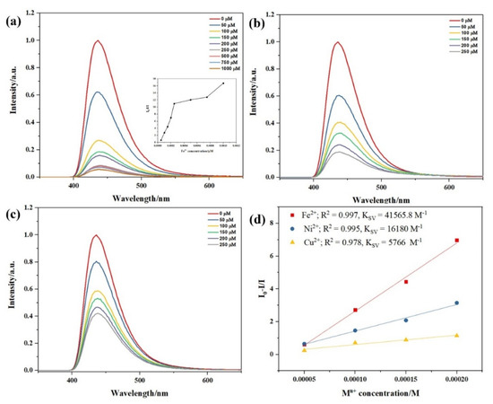 We studied the optical properties of the Mn+@TMU-17-NH2 (M = Fe3+, Ni2+ and Cu2+) when immersing in different concentrations of metal cations (Figure 4). It is obvious that the luminescence intensity at 440 nm is gradually decreased as the concentration of the metal cations increase. The fluorescence quenching follows the Stern–Völmer (SV) equation: I0/I = 1 + KSV[M], where I0 and I correspond to the luminescence intensity for TMU-17-NH2 in absence and presence of metal cations, respectively, [M] is the metal concentration, and KSV is the Stern–Völmer constant. An exceptionally high KSV value of 41,565 M−1 was obtained for Fe3+, while KSV for Ni2+ and Cu2+ were 16,180 and 5766 M−1, respectively. The high sensitivity allows us to easily identify the existence of a small amount of Fe3+ ions. Based on the slope of the calibration curve (K) values and the standard deviations (Sb) from ten repeated fluorescent measurements of blank solutions, the detection limits (3Sb/K) of TMU-17-NH2 towards Fe3+ ion in DMF were calculated to be 0.7 μM (corresponding to 40 ppb).