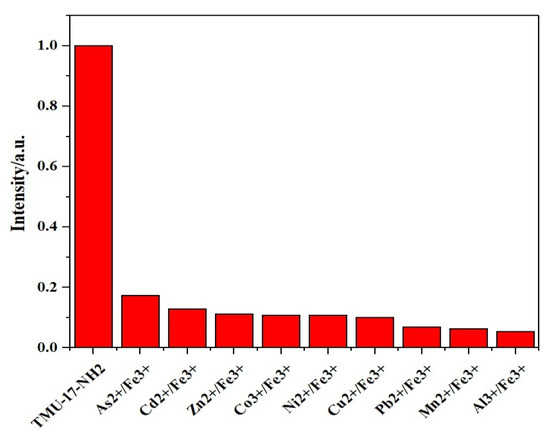It should be pointed out that usually many metal ions coexist in practical biological and environmental systems. Further experiments for the effect of coexisting metal ions on the quenched fluorescence intensity of TMU-17-NH2 using Fe3+ were performed to show the selectivity of TMU-17-NH2 for detecting Fe3+ (Figure 5). It is very encouraging that TMU-17-NH2 shows high anti-interference from other coexisting metal ions.