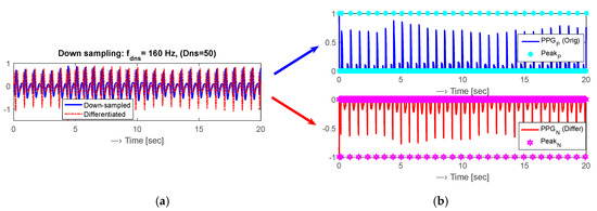 - determination of the positive/negative polarity of the down-sampled/differentiated PPG signal —see an example for a selected region of interest (ROI) of 20 s in Figure 1,