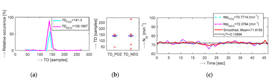 Finally, curves of both signal polarities are smoothed by a filter, mean Ntp is calculated and of the linear trend (LT) is determined from the whole analyzed PPG signal—see the graphs in Figure 2.