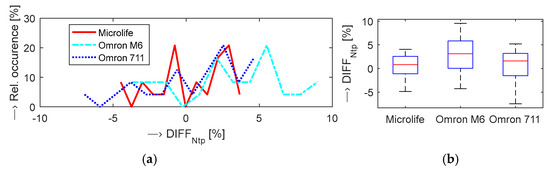To prevent any influence of an inflated pressure cuff of BPM on a tested person’s blood system, the PPG signal must be picked up from the opposite hand. In practical realization of this experiment, the PPG signal was always picked up from the pinkie of the right hand and the cuff was put on the left arm. Six volunteer persons (four males and two female) took part in this measurement, 12 data records per person were always collected, 72 in total. The obtained results of the relative differences in [%] between Ntp values determined from the PPG signal and measured by three tested BPMs are presented in Figure 4.