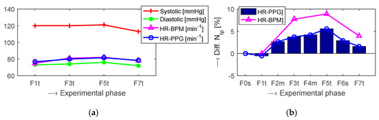 Partial comparison of values measured by the BPM device and determined from the PPG signal: BP and HR values in four measuring phases (a); relative differences in [%] between Ntp/HR values determined from the PPG signal/by the BPM device in all eight experimental phases relative to the F0s/F1t as a baseline (b), for the male tested person, experiment no. 2.