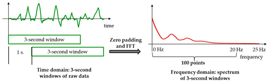 We implemented a signal processing chain for data collection: pre-process module, segmentation and transformation. First, we performed a linear interpolation of raw sensory data from the accelerometer for dealing with wireless data loss. Second, we used Hamming windowing to divide the data into 3-s windows (150 samples per window) separated by 1 s. Each window was labeled by the mode of the classes included in the sample sequence. Third, we used two data formats as input of the deep learning architecture. On the one hand, we directly used raw data in time domain. Acceleration signals from static activities such as sitting or standing have a particular behavior in time domain: they keep an almost constant value. On the other hand, we expanded each window to 256 points using zero padding. After that, we obtained the module of the Fast Fourier Transform (FFT). Since the FFT is symmetric, we obtained a 128-point representation of the spectrum in the 0–25 Hz frequency band. From this representation, we selected the first 100 points of the spectrum corresponding approximately to the 0–20 Hz frequency range, discarding negligible energy above 20 Hz in these signals. Dynamic activities such as walking or jogging are characterized by energy and periodicity, which is noticeable in the frequency domain. Figure 1 represents the signal processing performed to the acceleration signals. In the dataset, we have a total of 27,762 windows.