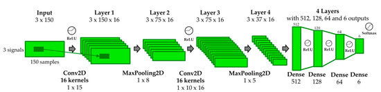 The deep learning architecture that provides the best performance was composed of two convolutional and two max-pooling layers with decreasing kernel sizes, as it is shown in Figure 2.