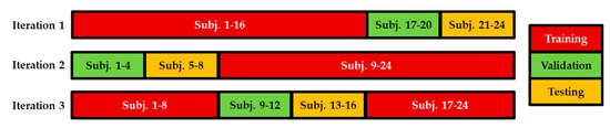 In this study, we used a subject-wise three-fold cross-validation. For each iteration, we divided data from the 24 subsets into three subsets: one subset including data from 16 subjects (around 20,000 windows) was used for training, one subset including data from 4 subjects was used for testing and one subset including data from 4 subjects was used for validation. Figure 3 shows the subsets for the three iterations of subject-wise cross-validation. This way, recordings from the same subject did not appear in training and testing subsets at the same experiment.