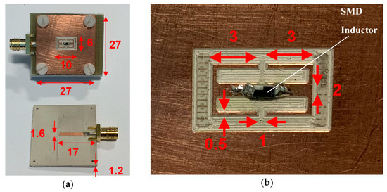 (a) Geometry of an assembled sensor (top) and feeding microstrip layer (bottom). The relative permittivity of substrates is 10. There is no gap between the top layer and the feeding layer. Overall sensor thickness is 3.6 mm. The sensor’s standoff distance from the metal plate is 1 mm to 7 mm. (b) Enhanced view of the sensor aperture, where the sensor center-gap is loaded with a 3.6 nH surface-mount inductor. All dimensions are in mm.