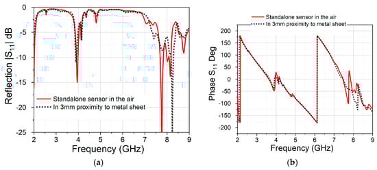 Measured reflection parameter |S11|magnitude (a) and phase (b), of a standalone sensor in the air and in proximity to metal plate at stand-off distance of 5 mm.