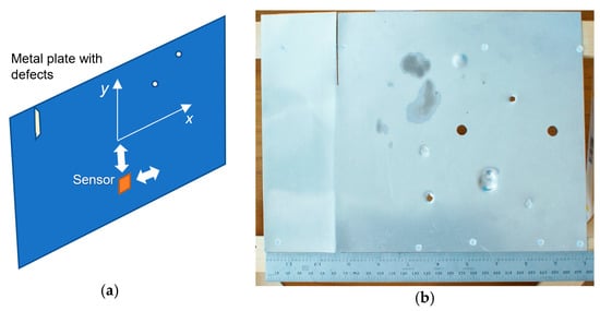 (a) Schematic geometry of scanning near field setup. The sensor’s standoff distance from the metal plate is 1 mm to 7 mm. (b) Metal plate with various defects.