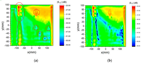 Reflected image represented by the |S11|parameter magnitude at different frequencies: (a) 7.7773 GHz. (b) 7.7776 GHz. Encircled areas on Figure 4a show actual defects.