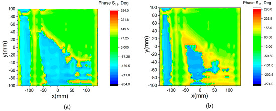 Reflected image represented by the S11 parameter phase at different frequencies: (a) 7.7773 GHz. (b) 7.7776 GHz.