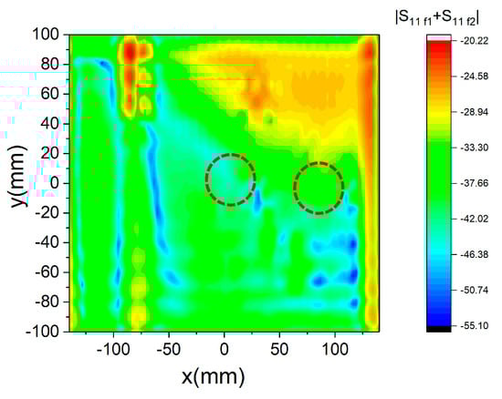 It can be seen that several artefacts present in the Figure 4b image are eliminated, namely two defects in the middle of the metal plate (encircled) are enhanced by around 4 dB. At the same time, some artefacts are still present, which requires iterative applications of the proposed algorithm at several frequencies. Another challenge is associated with very uneven surface of the defected board which complicates point-like defect localization. In this situation it might be worthwhile to reduce the Q-factor of the resonance sensor to achieve wider frequency bandwidth and better feature localization at the cost of defect-to-background contrast reduction.