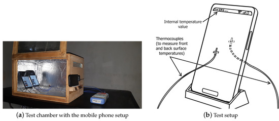 Temperature monitoring tests were conducted in a cuboid wooden test chamber (Figure 1a). To prevent radiant heat exchange across the walls of the test chamber, five of the inner surfaces of the chamber were lined with a reflective aluminum foil, while the sixth was made of a glass sheet. Other materials for the experiments included two smartphones of the same model, a plastic casing for the test phone, a Seek Compact infrared (IR) thermal camera, k-type thermocouple sensors and a digital temperature logger.